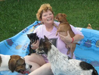 Well, who is happier? Me or the dogs? I think it’s a toss-up. Last year we bought a little pool because all we had was Chihuahuas; this year Ronnie found a big one and it was an immediate hit. Even after I got out the big dogs would get back in, especially Maximus. I was so glad to see that. Too bad we can’t leave water in it for them all the time; it’s so hot and dry this summer. But if one of the little ones drowned in it I’d never forgive myself. And, too, the big dogs would probably chew it up and then no one would have a pool. Sometimes there’s too many details to having fun……..